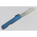 播州三木で伝統を守り続ける肥後守(ひごのかみ)ナイフです。切れ味豊かな万能折りたたみナイフです。高級刃物鋼の青紙割込みタイプです。カラーメッキ鞘に滑り止めを兼ねて樹脂をぷつぷつと吹付けて、黒・青・ピンクの美しい水飛沫(みずしぶき)模様に仕上げました。